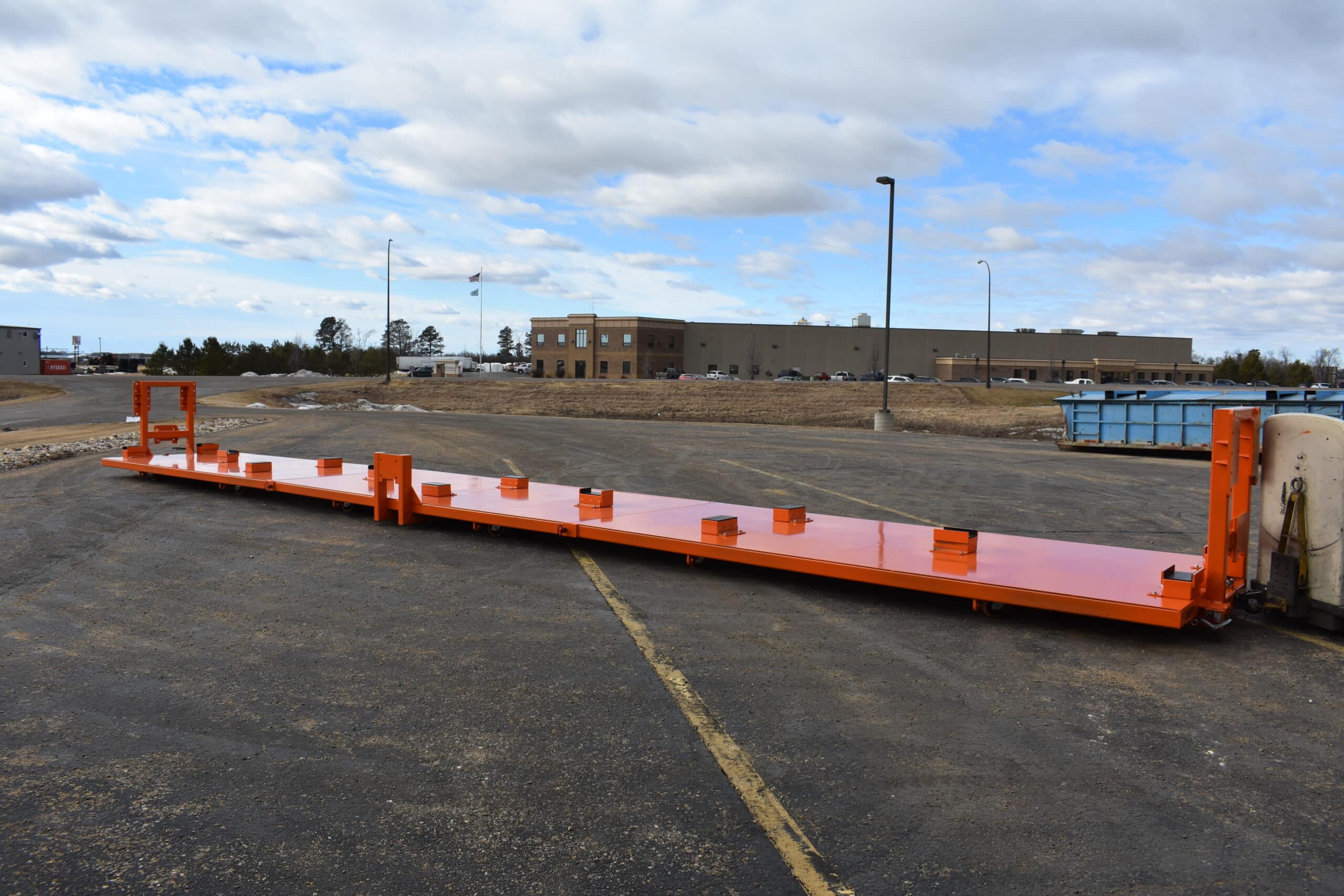 Built with a steel frame and rated for a 12,000 lb capacity, this cart is intended for applications that require controlled movement, precise positioning, and stable support of long structural components. Saddles mounted on the deck position the frame in the correct orientation during transport and staging.