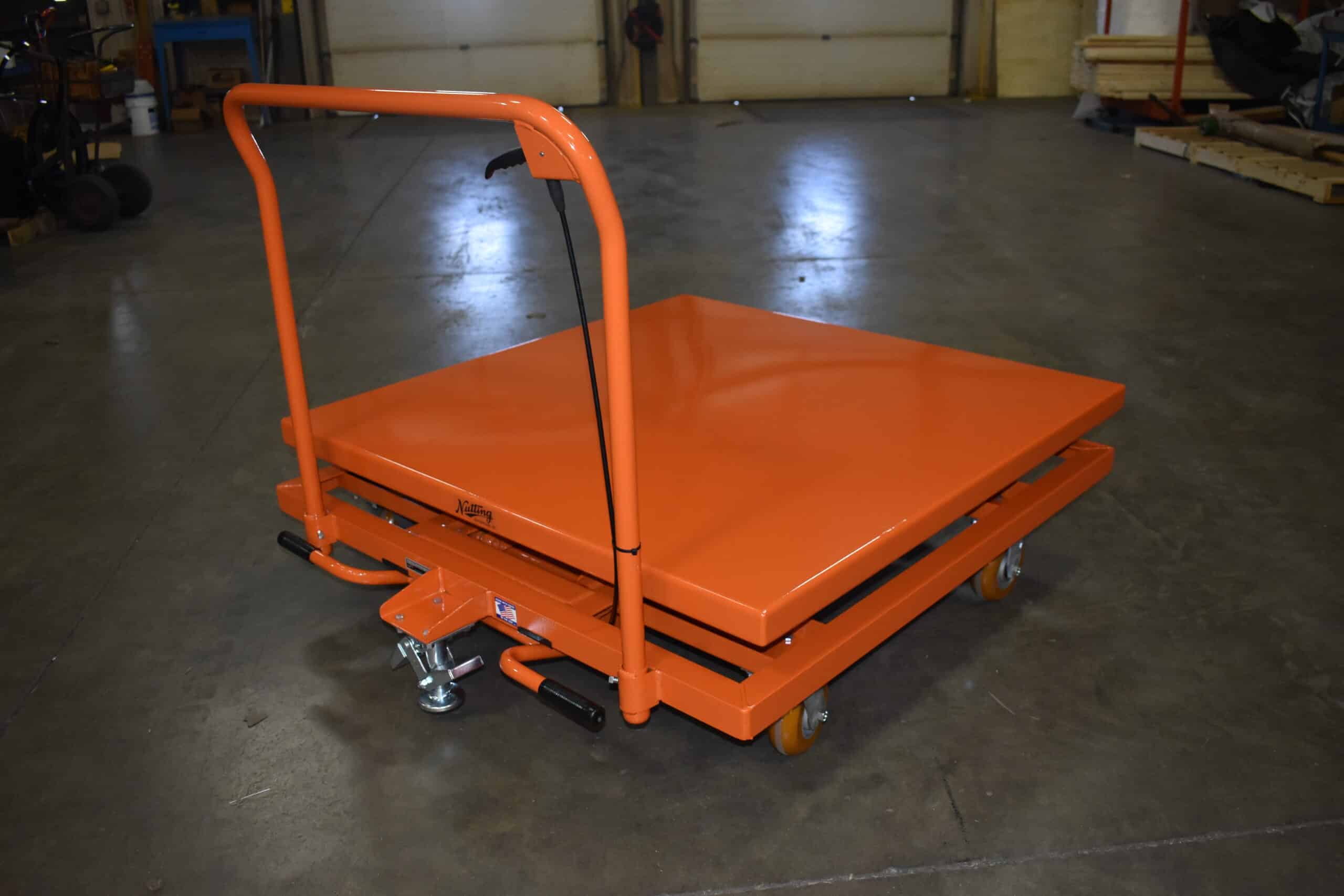 With a 48 x 48 platform and a 2,000 lb load capacity, this cart allows operators to position pallets of parts at a comfortable working height. The integrated scissor lift helps eliminate bending and repetitive strain by bringing materials up to the operator rather than requiring manual lifting.