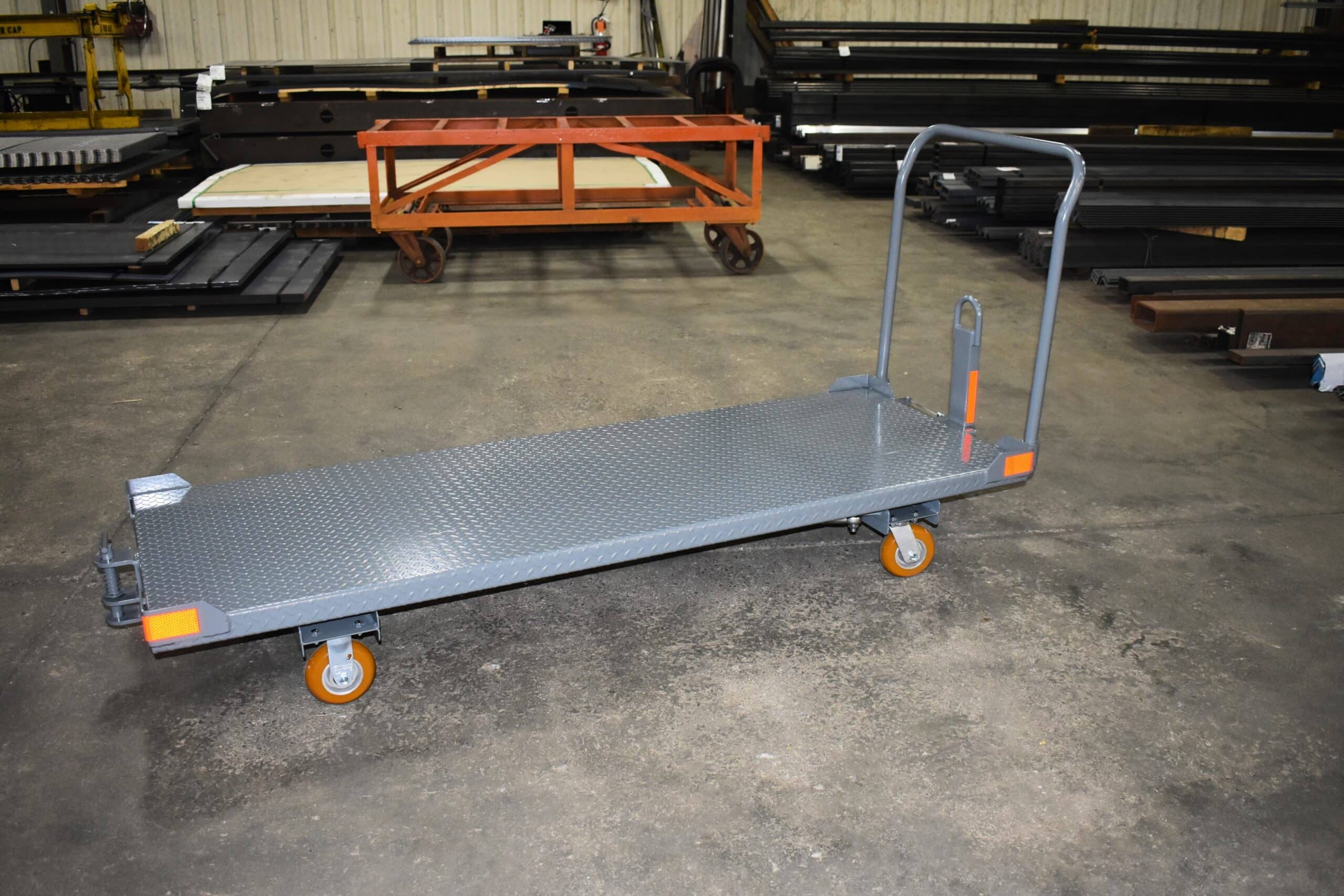 The Z54-010-074 is a 30×85 steel tread plate hybrid steer cart designed for transporting pallets of auto parts in manufacturing and warehouse environments. Rated for 2000 lb capacity, this industrial cart supports consistent pallet movement across production floors.