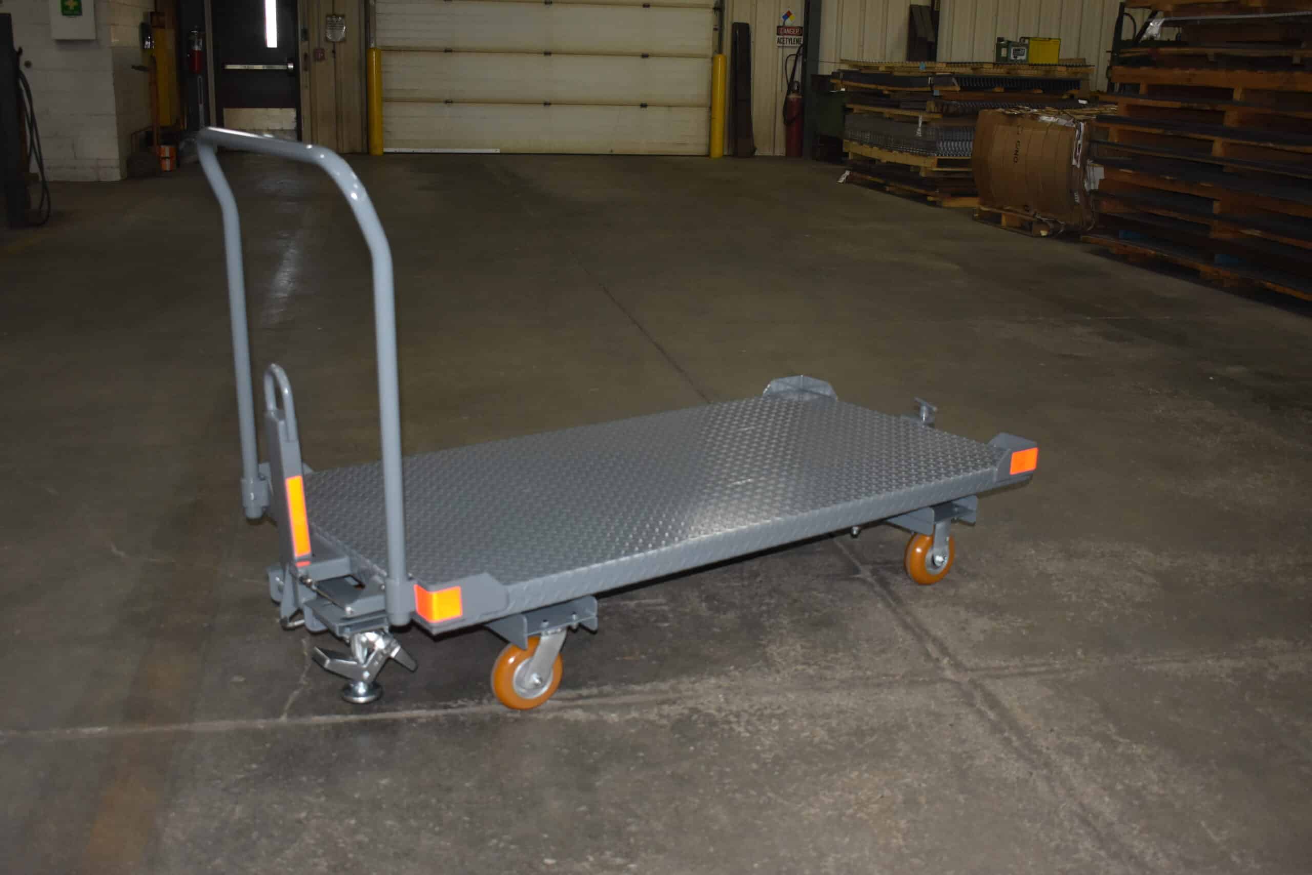 Constructed from steel tread plate, the deck provides durable load support. The cart is equipped with 6 inch ergonomic poly wheels for smooth rolling under load. A D ring tongue with spring loaded pin and clevis connection allows secure towing. Corner lips help contain palletized loads during transport.