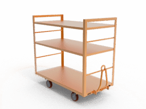 An industrial tugger cart is a cart designed to be easily towed to streamline the movement of goods and materials within industrial environments, significantly increasing efficiency. By attaching to an electric tugger or forklift, multiple carts can be pulled in a tugger train system, allowing for the simultaneous transport of large quantities of goods.